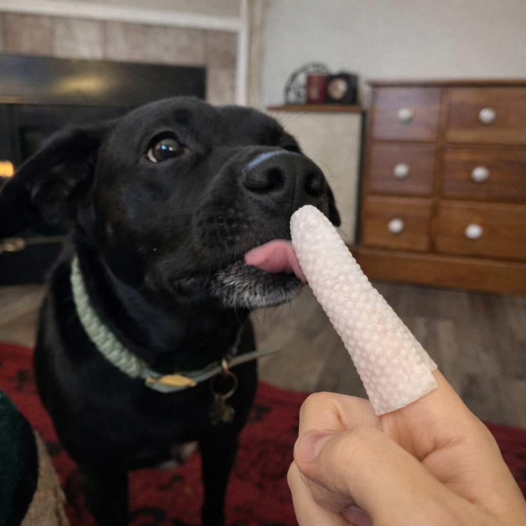 Coloca la toallita sobre tu dedo y frota suavemente los dientes y las encías de tu mascota con movimientos circulares.